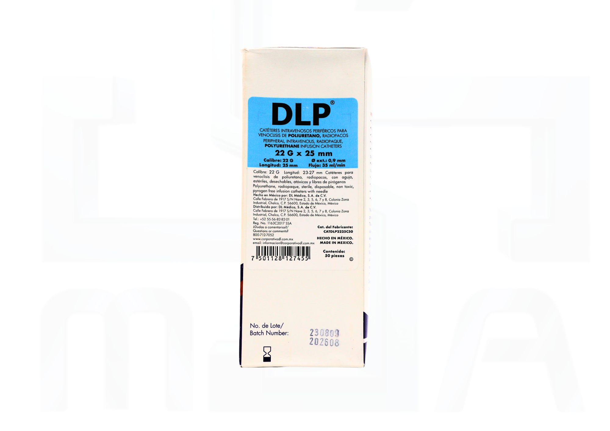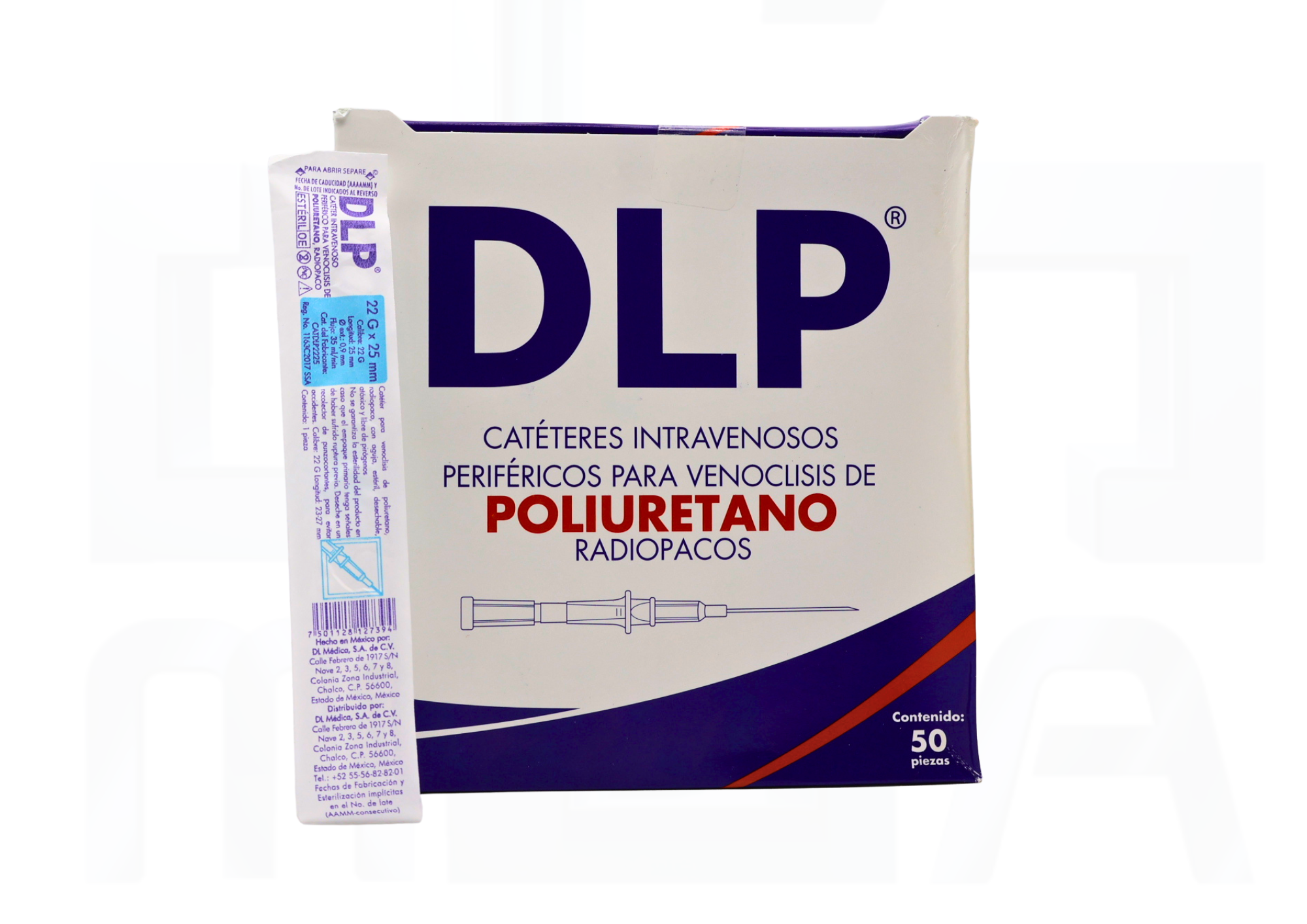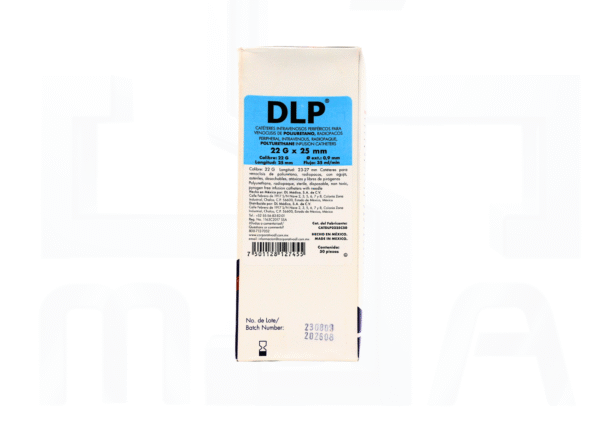 Catéter intravenoso periférico DLP, calibre 22 G y longitud 25 mm, diseñado para venoclisis. Fabricado con materiales de alta calidad, flexible y de fácil inserción. Estéril y listo para usar.